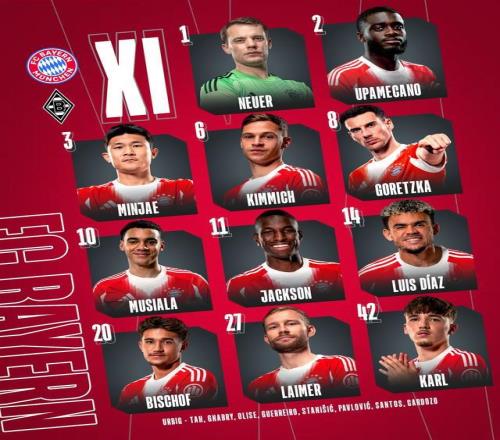 北京時(shí)間3月7日03:30,德甲 第25輪,拜仁慕尼黑主場(chǎng)迎戰(zhàn)門興格拉德巴赫,賽前雙方球隊(duì)首發(fā)名單公布如下: