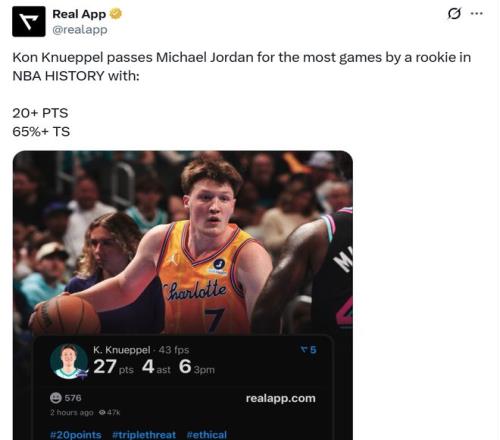 4號秀破喬丹紀錄 雖然黃蜂隊輸?shù)舯荣悾?號秀克努佩爾依舊是可圈可點,成功打破塵封41年之久的神紀錄。 全場克努佩爾出戰(zhàn)34分鐘,14中9,三分10中6,罰球3中3,高效砍下全隊最高的27分,外加2板4助,末節(jié)球隊陷入啞火絕境時,克努佩爾一度連中3記三分率隊追分,盡管沒能率隊翻盤,但表現(xiàn)依舊可圈可點,尤其是考慮到他只是一名年僅20歲的年輕新秀。 憑借這樣的表現(xiàn),克努佩爾本賽季已經(jīng)27次單場交出至少20+得分且真實命中率至少為65%,打破喬丹1984-85賽季保持的NBA歷史新秀紀錄,而黃蜂本賽季還有18場常規(guī)賽要打,按照克努佩爾的狀態(tài),他勢必將大幅提升這一紀錄。