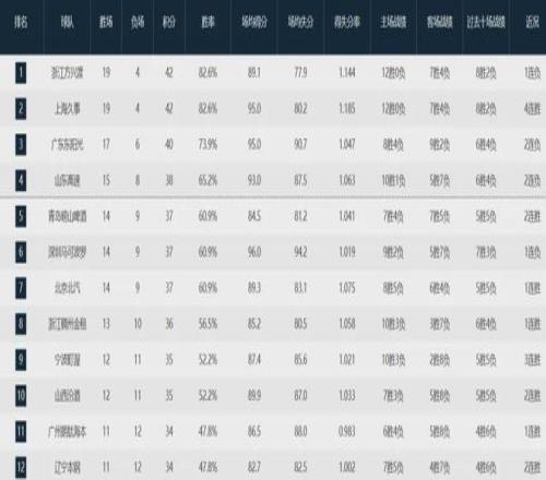 本賽季至今,廣東隊17勝6負聯(lián)盟第三,廣廈隊和上海隊分列前二,山東隊第四,青島隊第五,深圳隊第六,北京隊第七,浙江隊第八,寧波隊第九,山西隊第十,廣州隊第11,遼寧隊第12。