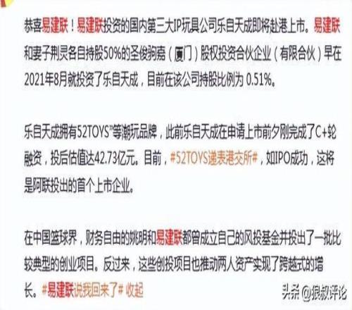 北京時間3月19日,根據(jù)廣東體育頻道記者關(guān)辛的社媒報道,出席薪火訓練營的活動當中,大哥易建聯(lián)作為代表上臺發(fā)言。 從鏡頭可以到阿聯(lián)又黑了,不過精神狀態(tài)卻是越來越好。 關(guān)辛和易建聯(lián)互動當中,調(diào)侃又黑了,都要曬出斑了,易建聯(lián)則是滿面笑容回應。 由于涉嫌PC丑聞事件,阿聯(lián)過去2年漸漸消失在公眾視野,極少出現(xiàn)在相關(guān)品牌活動,但自身品牌的薪火訓練營活動,阿聯(lián)和王仕鵬依舊是代表之一,兩人均亮相本次的活動。 對于阿聯(lián)何時才真正回歸公眾視野,截止目前并沒有官方的說法,但根據(jù)此前的媒體報道,阿聯(lián)早已實現(xiàn)了“財務自由”,可以提供選擇的比較多的情況下,或許更多的時間以休息為主。 去年,根據(jù)國內(nèi)媒體的報道,易建聯(lián)投資的國內(nèi)第三大IP玩具公司樂自天成即將赴港上市。易建聯(lián)和妻子荊靈各自持股50%的圣俊駒嘉(廈門)股權(quán)投資合伙企業(yè)(有限合伙)早在2021年8月就投資了樂自天成,目前在該公司持股比例為 0.51%。 樂自天成擁有52TOYS”等潮玩品牌,此前樂自天成在申請上市前夕剛完成了C+輪融資,投后估值達42.73億元。目前,若IPO成功,這將是阿聯(lián)投出的首個上市企業(yè)。 在中國籃球界,財務自由的姚明和易建聯(lián)都曾成立自己的風投基金并投出了一批比較典型的創(chuàng)業(yè)項目。反過來,這些創(chuàng)投項目也推動兩人資產(chǎn)實現(xiàn)了跨越式的增長。 |