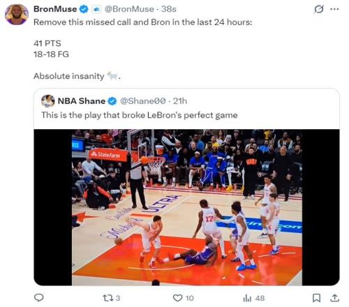 湖人媒體:如果不算申京那個(gè)犯規(guī)沒(méi)有吹罰的未進(jìn)球,詹姆斯在短短24小時(shí)內(nèi)是一波18中18,這實(shí)在是太瘋狂了,GOAT。