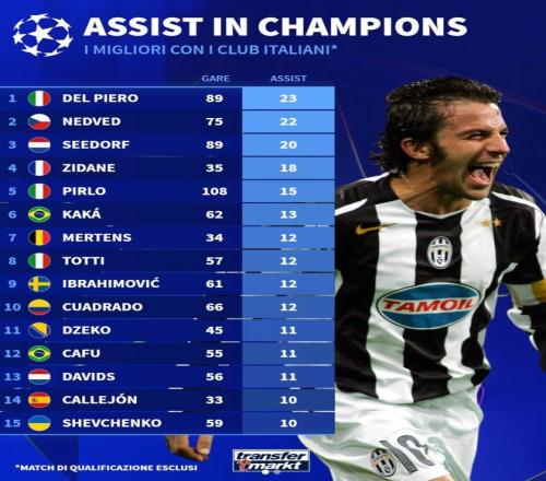 北京時間3月21日,德轉(zhuǎn)統(tǒng)計出了意甲球員歐冠歷史助攻榜,德爾-皮耶羅以23次助攻位列第一,現(xiàn)役球員中夸德拉多排名最高,他以12次助攻位列第10位。