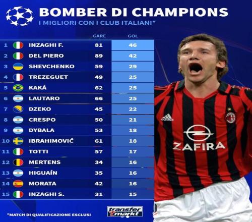 1. 菲利波-因扎吉 81場(chǎng) 46球 2. 德爾-皮耶羅 89場(chǎng) 42球 3. 舍甫琴科 59場(chǎng) 29球 4. 特雷澤蓋 49場(chǎng) 25球 5. 卡卡 62場(chǎng) 25球 6. 勞塔羅 66場(chǎng) 25球 7. 哲科 45場(chǎng) 22球 8. 克雷斯波 50場(chǎng) 21球 9. 迪巴拉 53場(chǎng) 18球 10. 伊布拉希莫維奇 61場(chǎng) 18球 11. 托蒂 57場(chǎng) 17球 12. 梅爾滕斯 34場(chǎng) 16球 13. 伊瓜因 35場(chǎng) 16球 14. 莫拉塔 42場(chǎng) 16球 15. 西蒙尼-因扎吉 31場(chǎng) 15球 |