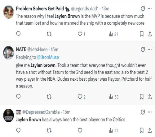 綠凱球迷:1.我之所以認為布朗才是MVP,是因為這支球隊遭遇了重大打擊,布朗帶著全新的陣容依舊是東部勁旅; 2.給我投布朗,他帶領這支球隊打到東部第二,他成為這支球隊最好的球員,塔圖姆才剛剛復出,他就帶著普理查德之流硬扛了大半個賽季; 3.杰倫-布朗一直是凱爾特人最出色的球員。 |