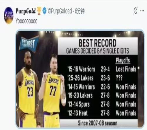 湖人又贏了一場(chǎng)硬仗。 昨天打熱火,東契奇60分,詹姆斯關(guān)鍵防守,斯瑪特致命搶斷。最后5分鐘,分差5分以內(nèi),湖人又拿下了。這是他們本賽季第21場(chǎng)關(guān)鍵時(shí)刻勝利,聯(lián)盟第一。