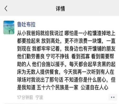 在救護(hù)車上一邊接受治療,一邊拿起手機(jī)發(fā)文聲討李祥波的魯吐布拉表示:從小我爸媽就給我說過,哪怕是一小粒馕渣掉地上都要撿起來,放到高處,更不許浪費(fèi)一塊,一直到現(xiàn)在我都牢牢記著,我身邊也有開馕鋪的朋友,他們勤勞善良,寧可不掙錢,看到孤寡,看到需要幫助的人,他們會(huì)施以援手。每天都會(huì)起早貪黑的起床為無數(shù)人提供餐食,今天我再一次聽到有人在球場對我說出了那句話,不知道你是什么居心,但是我知道五十六個(gè)民族是一家,公道自在人心。