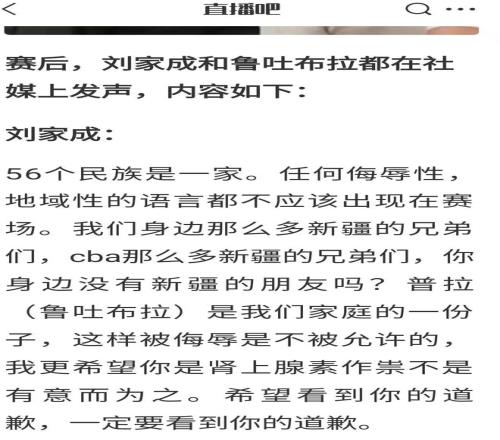 下面再來看看兩位當(dāng)事人是怎么說的,賽后劉總和魯吐布拉都在個(gè)人社媒上發(fā)文怒斥李祥波,劉總表示:56個(gè)民族是一家。任何侮辱性,地域性的語言都不應(yīng)該出現(xiàn)在賽場