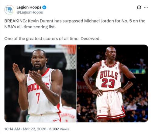 超越喬丹!杜蘭特升至NBA歷史得分榜第五位