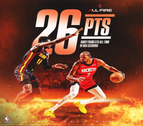 火箭官方:銘刻于歷史之中的杜蘭特,他剛剛在總得分上超越喬丹成為NBA歷史得分榜排名第五的球員。