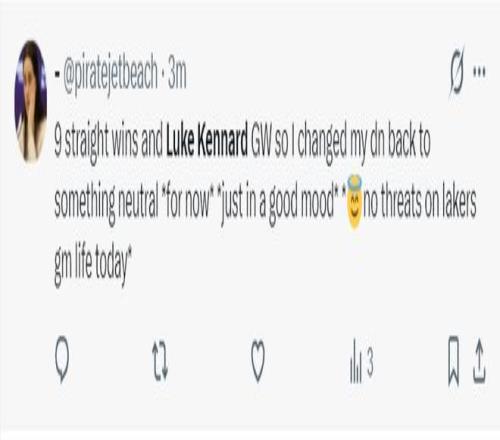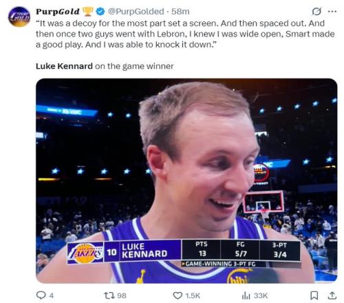 賽后湖人球迷寫(xiě)道:肯納德這是一個(gè)多么冷酷無(wú)情的時(shí)刻啊,他不僅完成了絕殺,他還幫助詹姆斯完成了歷史性的時(shí)刻,詹姆斯超越帕里什成為歷史出場(chǎng)王。這就是湖人引進(jìn)他的原因,他總是在關(guān)鍵時(shí)刻挺身而出,在詹姆斯、東契奇、里夫斯被限制的情況下他在決勝時(shí)刻命中絕殺。