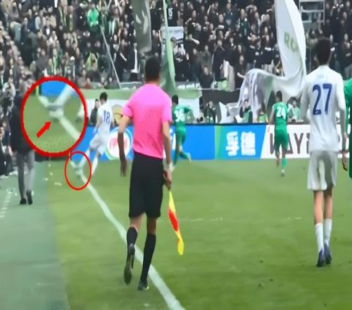 那么,這位申花主帥的抱怨有沒有道理,球是不是真如他所看到的那樣根本沒出界呢?答案很快就給了出來。轉(zhuǎn)播畫面放出劉誠宇帶球的過程片段(下圖),不過這個(gè)重放畫面的速度還是太快,外界難以看出是不是出界。