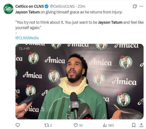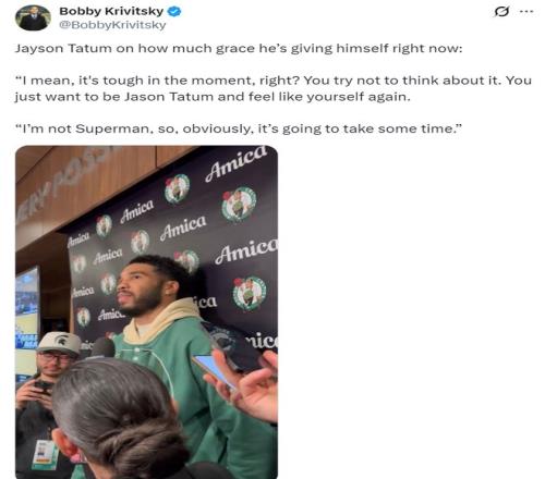 塔圖姆還說道:我從那些經(jīng)歷過跟腱斷裂的球員、我的家人、醫(yī)護人員中獲得了一些慰藉,畢竟大傷后心理上的創(chuàng)傷跟身體一樣難以愈合。 我知道當下很難,要回到當年那個杰森-塔圖姆太難了,我知道自己不是超人,顯然還需要一些時間才能恢復到那時候?,F(xiàn)在我更多是心理層面的問題,我跟教練組的交流很多,比如某些戰(zhàn)術(shù)安排、某些身體接觸等等。